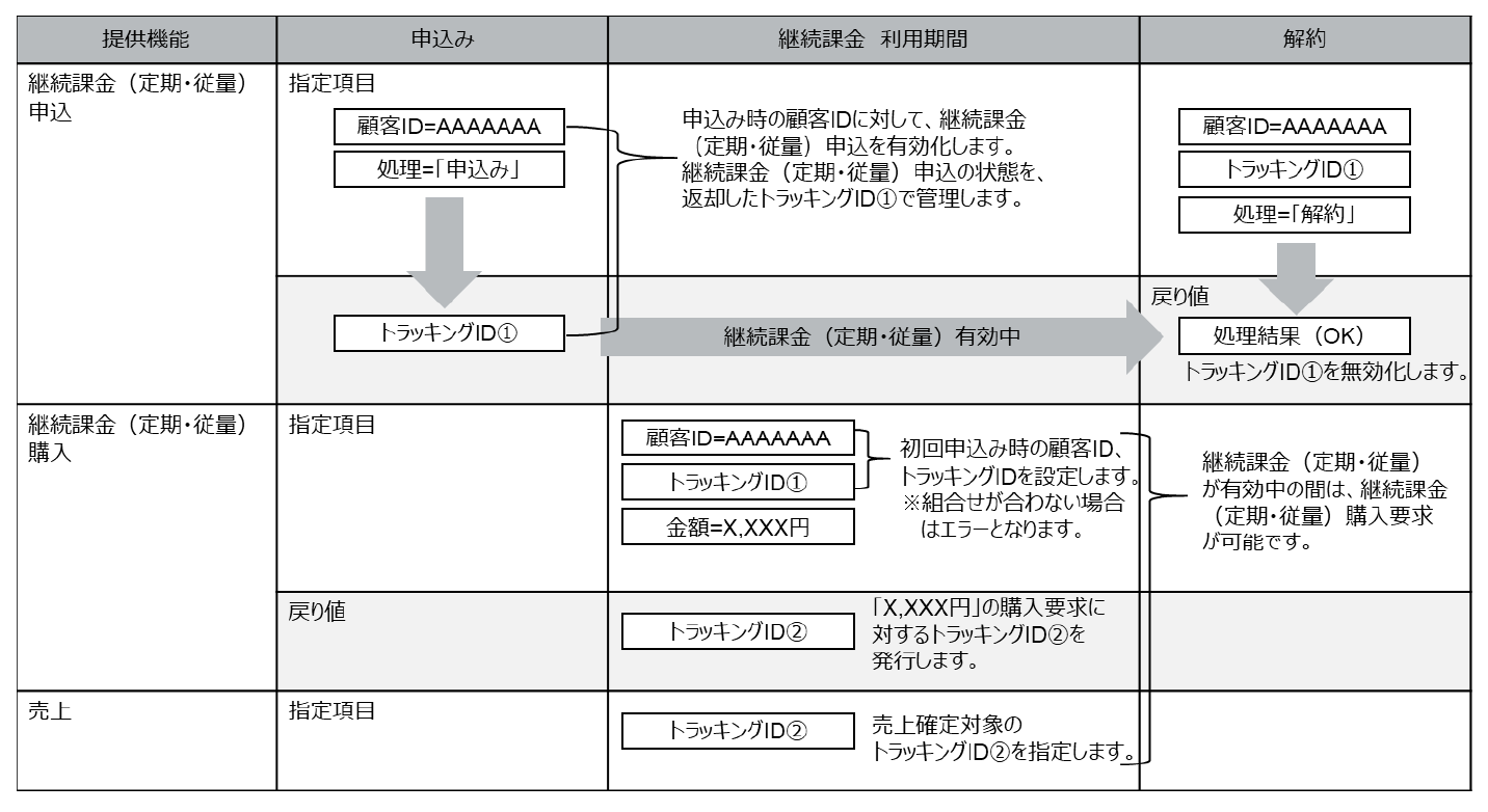 | 継続課金(定期・従量)購入 | 登録済みのエンドユーザーに対して、課金処理を実施する機能です。 発行済み継続課金管理用トラッキングIDを用いて、課金処理を行います。 |