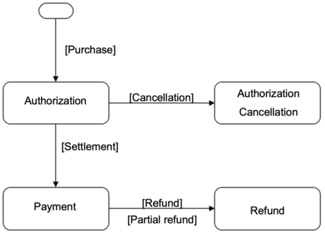 提供している各機能を実施することで、以下のように決済のステータスが遷移します。各機能の実施方法については、リンク型 IF仕様、API型 IF仕様、および「SBPS決済管理ツール機能マニュアル」を参照ください。