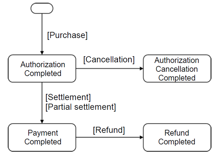 By implementing each of the functions provided, the status of the Payment will Transition as follows. For details on how to implement each function, refer to the Link Type IF specification, the API type IF specification, and the SBPS Admin portal / Payment management tool Function Manual.