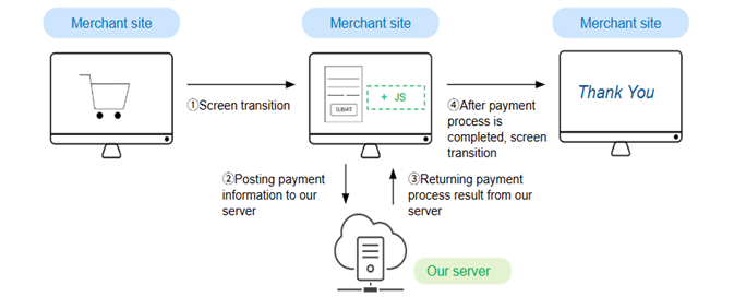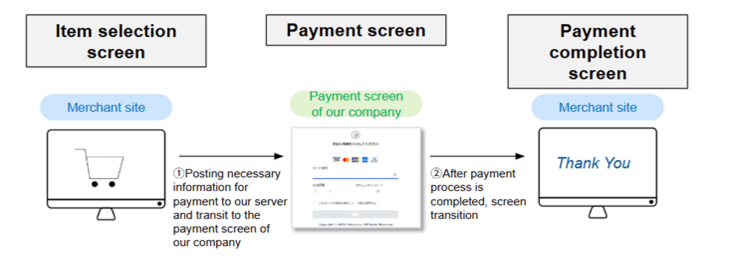 Various processes are realized by communicating between merchant company and affiliated stores using XML, which will be described later. Since merchant can freely create their own screens for Payment procedures, this is a highly flexible system connection method.